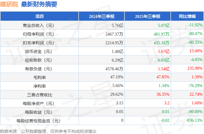 据证券之星公开数据整理,近期建研院(603183)发布2025年三季报。截至本报告期末,公司营业总收入5.07亿元,同比下降11.92%,归母净利润481.97万元,同比下降80.47%。按单季度数据看,第三季度营业总收入1.83亿元,同比下降11.67%,第三季度归母净利润162.06万元,同比下降71.89%。本报告期建研院公司应收账款体量较大,当期应收账款占最新年报归母净利润比达1000.37%。