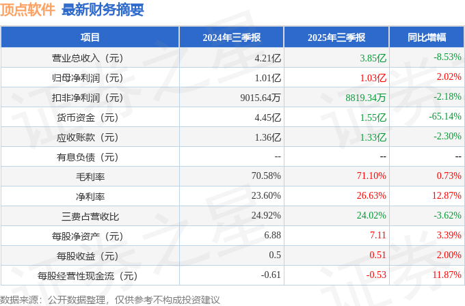 据证券之星公开数据整理,近期顶点软件(603383)发布2025年三季报。截至本报告期末,公司营业总收入3.85亿元,同比下降8.53%,归母净利润1.03亿元,同比上升2.02%。按单季度数据看,第三季度营业总收入1.39亿元,同比下降9.5%,第三季度归母净利润5040.37万元,同比下降3.91%。本报告期顶点软件盈利能力上升,毛利率同比增幅0.73%,净利率同比增幅12.87%。