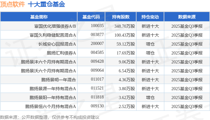 持有顶点软件最多的基金为富国优化增强债券A/B,目前规模为49.41亿元,最新净值2.071(10月28日),较上一交易日下跌0.19%,近一年上涨23.05%。该基金现任基金经理为刘兴旺。