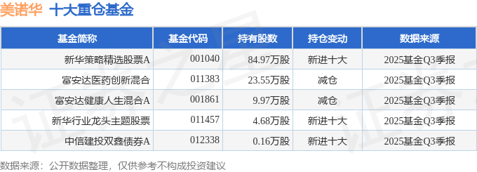 持有美诺华最多的基金为新华策略精选股票A,目前规模为5.49亿元,最新净值2.15(10月27日),较上一交易日上涨1.54%,近一年上涨74.65%。该基金现任基金经理为赵强。