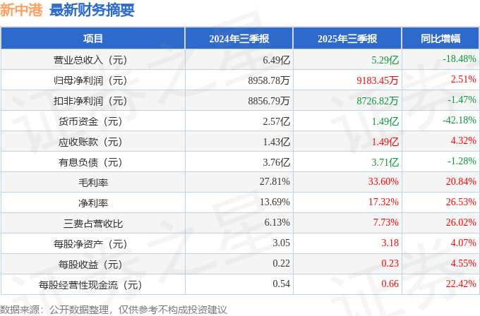 据证券之星公开数据整理,近期新中港(605162)发布2025年三季报。截至本报告期末,公司营业总收入5.29亿元,同比下降18.48%,归母净利润9183.45万元,同比上升2.51%。按单季度数据看,第三季度营业总收入1.64亿元,同比下降20.08%,第三季度归母净利润3002.41万元,同比上升21.13%。本报告期新中港盈利能力上升,毛利率同比增幅20.84%,净利率同比增幅26.53%。
