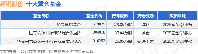 持有新锐股份最多的基金为华夏稳增混合,目前规模为12.0亿元,最新净值3.452(10月28日),较上一交易日上涨0.17%,近一年上涨45.16%。该基金现任基金经理为彭海伟。