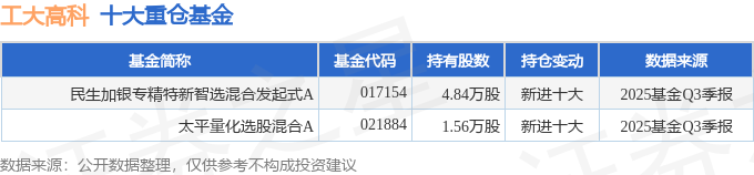持有工大高科最多的基金为民生加银专精特新智选混合发起式A,目前规模为0.59亿元,最新净值1.2862(10月28日),较上一交易日上涨0.02%,近一年上涨51.76%。该基金现任基金经理为周帅。