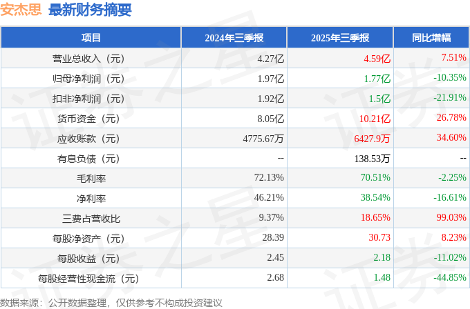 据证券之星公开数据整理,近期安杰思(688581)发布2025年三季报。截至本报告期末,公司营业总收入4.59亿元,同比上升7.51%,归母净利润1.77亿元,同比下降10.35%。按单季度数据看,第三季度营业总收入1.57亿元,同比下降3.89%,第三季度归母净利润5098.93万元,同比下降30.15%。本报告期安杰思三费占比上升明显,财务费用、销售费用和管理费用总和占总营收同比增幅达99.03%。