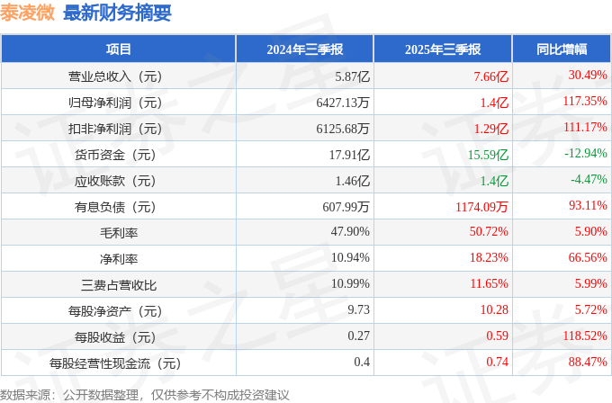据证券之星公开数据整理,近期泰凌微(688591)发布2025年三季报。截至本报告期末,公司营业总收入7.66亿元,同比上升30.49%,归母净利润1.4亿元,同比上升117.35%。按单季度数据看,第三季度营业总收入2.63亿元,同比上升18.57%,第三季度归母净利润3861.46万元,同比上升3.56%。本报告期泰凌微盈利能力上升,毛利率同比增幅5.9%,净利率同比增幅66.56%。