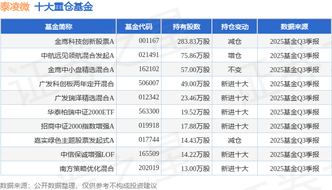 持有泰凌微最多的基金为金鹰科技创新股票A,目前规模为40.67亿元,最新净值1.95(10月27日),较上一交易日上涨1.03%,近一年上涨43.81%。该基金现任基金经理为陈颖。