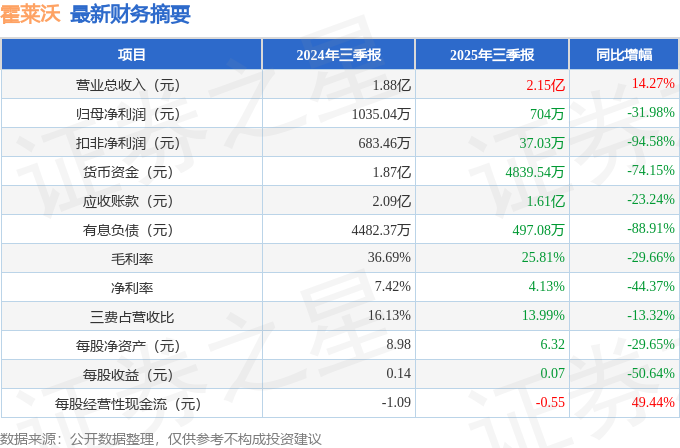 据证券之星公开数据整理,近期霍莱沃(688682)发布2025年三季报。截至本报告期末,公司营业总收入2.15亿元,同比上升14.27%,归母净利润704.0万元,同比下降31.98%。按单季度数据看,第三季度营业总收入1.13亿元,同比上升76.23%,第三季度归母净利润670.19万元,同比上升59.94%。本报告期霍莱沃存货明显上升,存货同比增幅达124.24%。