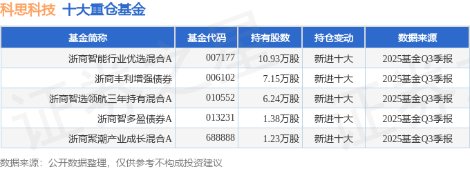 持有科思科技最多的基金为浙商智能行业优选混合A,目前规模为5.84亿元,最新净值1.3413(10月27日),较上一交易日上涨1.88%,近一年上涨37.8%。该基金现任基金经理为饶祖华。