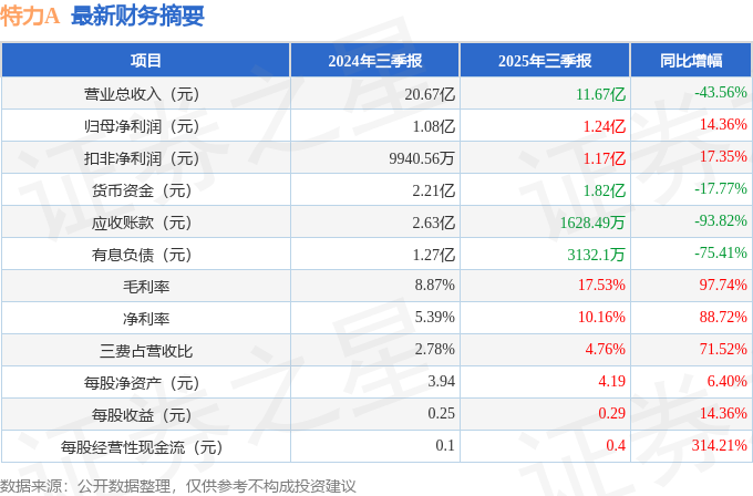 据证券之星公开数据整理,近期特力A(000025)发布2025年三季报。截至本报告期末,公司营业总收入11.67亿元,同比下降43.56%,归母净利润1.24亿元,同比上升14.36%。按单季度数据看,第三季度营业总收入2.89亿元,同比下降40.78%,第三季度归母净利润3958.65万元,同比上升25.98%。本报告期特力A盈利能力上升,毛利率同比增幅97.74%,净利率同比增幅88.72%。