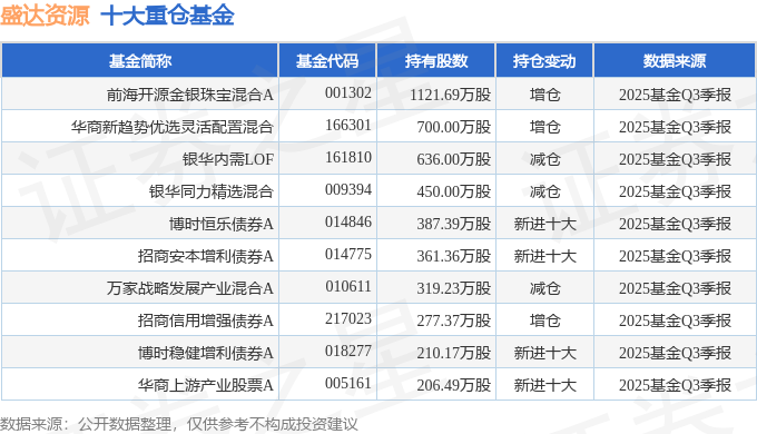 持有盛达资源最多的基金为前海开源金银珠宝混合A,目前规模为6.83亿元,最新净值2.414(10月27日),较上一交易日上涨1.6%,近一年上涨53.86%。该基金现任基金经理为吴国清。