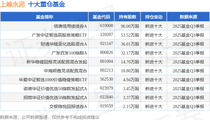 持有上峰水泥最多的基金为信澳信用债债券A,目前规模为10.78亿元,最新净值1.245(10月28日),较上一交易日下跌0.24%,近一年上涨25.68%。该基金现任基金经理为张旻。