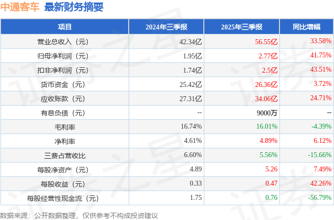 据证券之星公开数据整理,近期中通客车(000957)发布2025年三季报。截至本报告期末,公司营业总收入56.55亿元,同比上升33.58%,归母净利润2.77亿元,同比上升41.75%。按单季度数据看,第三季度营业总收入17.15亿元,同比上升15.99%,第三季度归母净利润8641.92万元,同比上升2.48%。本报告期中通客车公司应收账款体量较大,当期应收账款占最新年报归母净利润比达1365.24%。