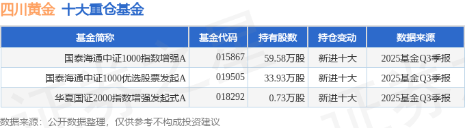 持有四川黄金最多的基金为国泰海通中证1000指数增强A,目前规模为11.28亿元,最新净值1.462(10月27日),较上一交易日上涨1.02%,近一年上涨46.13%。该基金现任基金经理为胡崇海 刘晟。