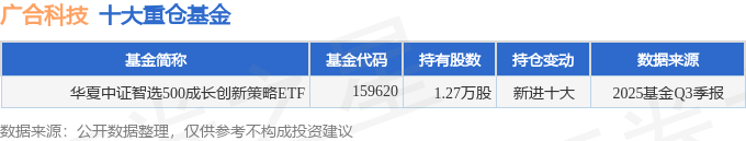 持有广合科技最多的基金为华夏中证智选500成长创新策略ETF,目前规模为0.59亿元,最新净值1.1728(10月28日),较上一交易日下跌0.3%,近一年上涨25.35%。该基金现任基金经理为荣膺。