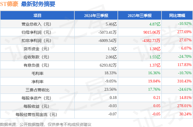 据证券之星公开数据整理,近期ST德豪(002005)发布2025年三季报。根据财报显示,ST德豪净利润同比增长277.69%。截至本报告期末,公司营业总收入4.87亿元,同比下降10.92%,归母净利润9015.06万元,同比上升277.69%。按单季度数据看,第三季度营业总收入1.79亿元,同比下降15.24%,第三季度归母净利润1.03亿元,同比上升1082.26%。