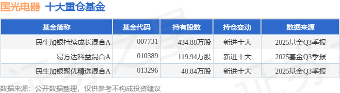持有国光电器最多的基金为民生加银持续成长混合A,目前规模为13.94亿元,最新净值1.9538(10月27日),较上一交易日上涨1.04%,近一年上涨33.26%。该基金现任基金经理为朱辰喆。