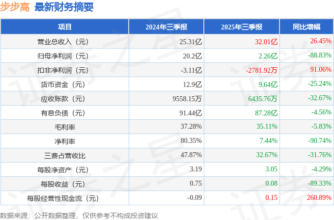 据证券之星公开数据整理,近期步步高(002251)发布2025年三季报。根据财报显示,步步高增收不增利。截至本报告期末,公司营业总收入32.01亿元,同比上升26.45%,归母净利润2.26亿元,同比下降88.83%。按单季度数据看,第三季度营业总收入10.67亿元,同比上升30.79%,第三季度归母净利润2486.97万元,同比下降98.81%。
