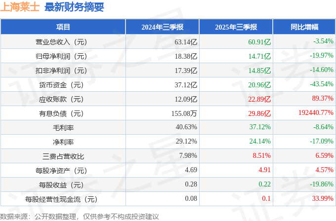 据证券之星公开数据整理,近期上海莱士(002252)发布2025年三季报。截至本报告期末,公司营业总收入60.91亿元,同比下降3.54%,归母净利润14.71亿元,同比下降19.97%。按单季度数据看,第三季度营业总收入21.39亿元,同比上升3.72%,第三季度归母净利润4.41亿元,同比下降26.16%。本报告期上海莱士应收账款上升,应收账款同比增幅达89.37%。