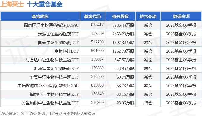 持有上海莱士最多的基金为招商国证生物医药指数(LOF)C,目前规模为15.39亿元,最新净值0.4317(10月28日),较上一交易日下跌0.74%,近一年上涨3.55%。该基金现任基金经理为侯昊 许荣漫。