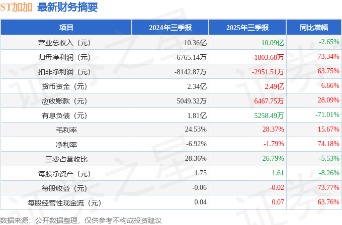 据证券之星公开数据整理,近期ST加加(002650)发布2025年三季报。截至本报告期末,公司营业总收入10.09亿元,同比下降2.65%,归母净利润-1803.68万元,同比上升73.34%。按单季度数据看,第三季度营业总收入2.76亿元,同比上升11.43%,第三季度归母净利润-2638.86万元,同比上升31.44%。本报告期ST加加盈利能力上升,毛利率同比增幅15.67%,净利率同比增幅74.18%。