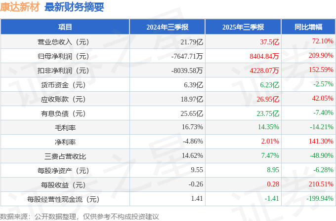 据证券之星公开数据整理,近期康达新材(002669)发布2025年三季报。截至本报告期末,公司营业总收入37.5亿元,同比上升72.1%,归母净利润8404.84万元,同比上升209.9%。按单季度数据看,第三季度营业总收入14.92亿元,同比上升82.7%,第三季度归母净利润3287.48万元,同比上升264.65%。本报告期康达新材公司应收账款体量较大,当期应收账款占最新年报营业总收入比达86.91%。