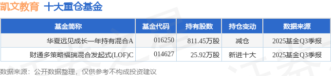 持有凯文教育最多的基金为华夏远见成长一年持有混合A,目前规模为6.0亿元,最新净值1.362(10月28日),较上一交易日上涨0.67%,近一年上涨48.16%。该基金现任基金经理为钟帅。