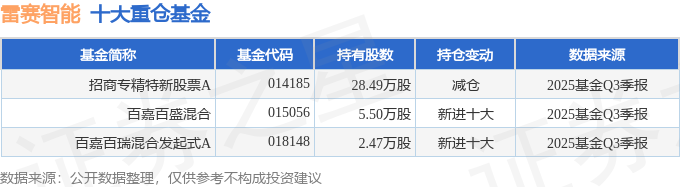 持有雷赛智能最多的基金为招商专精特新股票A,目前规模为1.99亿元,最新净值1.1714(10月28日),较上一交易日上涨0.14%,近一年上涨37.59%。该基金现任基金经理为韩冰。