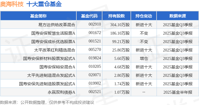 持有奥海科技最多的基金为易方达供给改革混合,目前规模为31.19亿元,最新净值3.4489(10月27日),较上一交易日上涨5.32%,近一年上涨33.42%。该基金现任基金经理为杨宗昌。