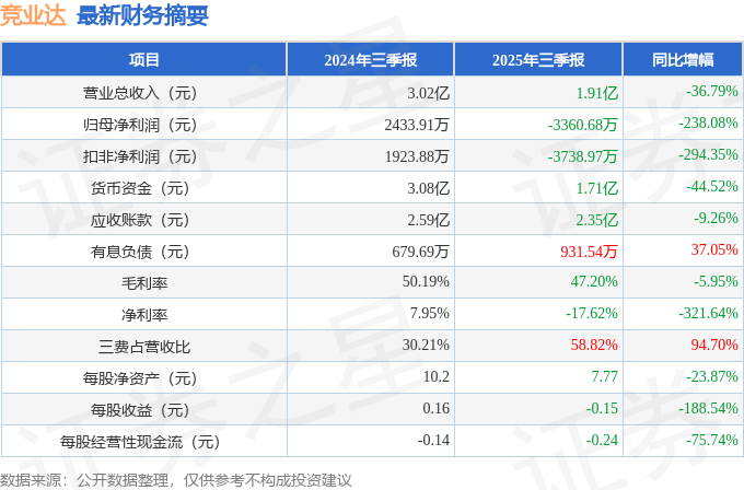 据证券之星公开数据整理,近期竞业达(003005)发布2025年三季报。截至本报告期末,公司营业总收入1.91亿元,同比下降36.79%,归母净利润-3360.68万元,同比下降238.08%。按单季度数据看,第三季度营业总收入7246.35万元,同比下降53.79%,第三季度归母净利润-1462.69万元,同比下降138.38%。本报告期竞业达三费占比上升明显,财务费用、销售费用和管理费用总和占总营收同比增幅达94.7%。