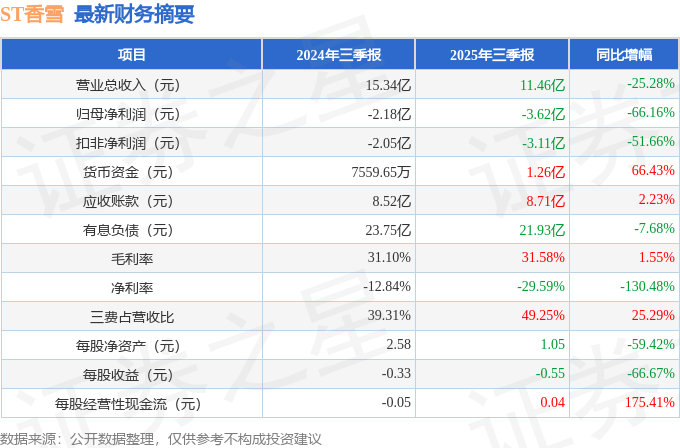 据证券之星公开数据整理,近期ST香雪(300147)发布2025年三季报。截至本报告期末,公司营业总收入11.46亿元,同比下降25.28%,归母净利润-3.62亿元,同比下降66.16%。按单季度数据看,第三季度营业总收入3.28亿元,同比下降24.96%,第三季度归母净利润-1.28亿元,同比下降55.04%。本报告期ST香雪短期债务压力上升,流动比率达0.27。