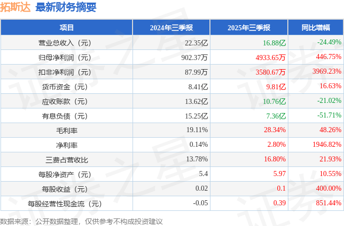 据证券之星公开数据整理,近期拓斯达(300607)发布2025年三季报。截至本报告期末,公司营业总收入16.88亿元,同比下降24.49%,归母净利润4933.65万元,同比上升446.75%。按单季度数据看,第三季度营业总收入6.02亿元,同比上升17.58%,第三季度归母净利润2060.43万元,同比上升176.93%。本报告期拓斯达盈利能力上升,毛利率同比增幅39.5%,净利率同比增幅1946.82%。