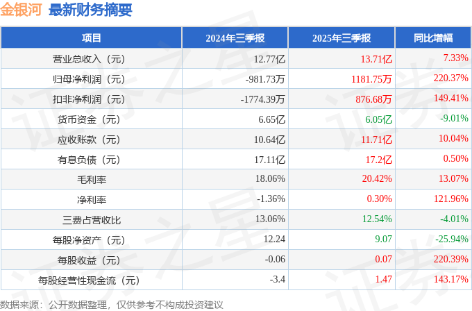 据证券之星公开数据整理,近期金银河(300619)发布2025年三季报。截至本报告期末,公司营业总收入13.71亿元,同比上升7.33%,归母净利润1181.75万元,同比上升220.37%。按单季度数据看,第三季度营业总收入7.11亿元,同比上升49.57%,第三季度归母净利润5398.25万元,同比上升1593.75%。本报告期金银河盈利能力上升,毛利率同比增幅8.8%,净利率同比增幅121.96%。