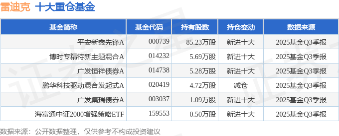 持有雷迪克最多的基金为平安新鑫先锋A,目前规模为8.51亿元,最新净值2.77(10月28日),较上一交易日上涨0.04%,近一年上涨38.94%。该基金现任基金经理为张晓泉。