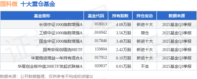 持有国科微最多的基金为长信中证1000指数增强A,目前规模为3.2亿元,最新净值1.4636(10月28日),较上一交易日上涨0.12%,近一年上涨48.39%。该基金现任基金经理为左金保。