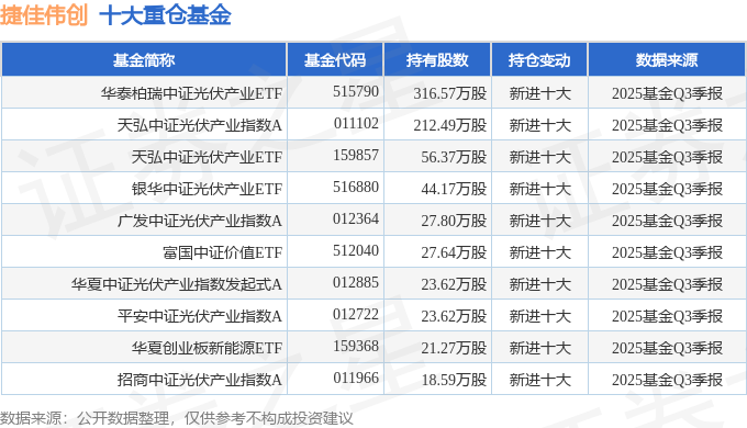持有捷佳伟创最多的基金为华泰柏瑞中证光伏产业ETF,目前规模为139.76亿元,最新净值0.9342(10月28日),较上一交易日下跌0.73%,近一年上涨5.36%。该基金现任基金经理为李茜 李沐阳。