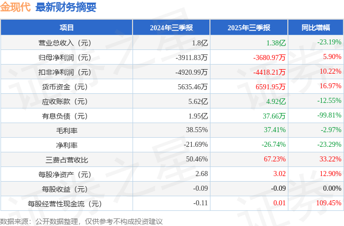 据证券之星公开数据整理,近期金现代(300830)发布2025年三季报。截至本报告期末,公司营业总收入1.38亿元,同比下降23.19%,归母净利润-3680.97万元,同比上升5.9%。按单季度数据看,第三季度营业总收入4296.4万元,同比下降38.07%,第三季度归母净利润-1437.98万元,同比下降5.39%。本报告期金现代三费占比上升明显,财务费用、销售费用和管理费用总和占总营收同比增幅达33.22%。