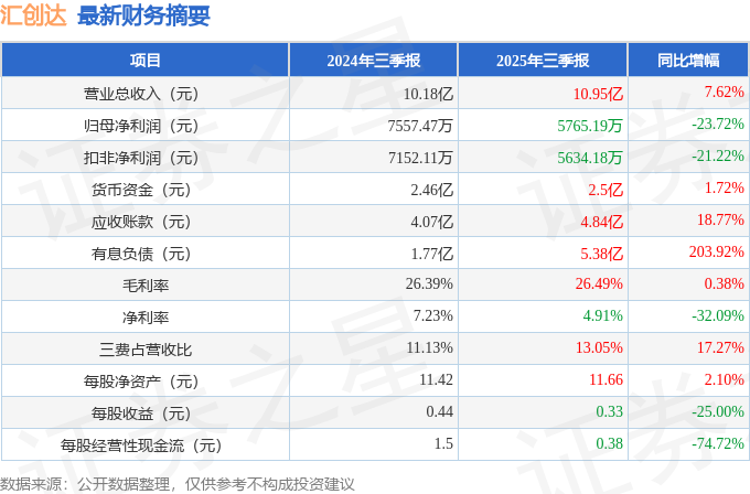 据证券之星公开数据整理,近期汇创达(300909)发布2025年三季报。截至本报告期末,公司营业总收入10.95亿元,同比上升7.62%,归母净利润5765.19万元,同比下降23.72%。按单季度数据看,第三季度营业总收入3.98亿元,同比上升7.07%,第三季度归母净利润2544.42万元,同比下降20.15%。本报告期汇创达公司应收账款体量较大,当期应收账款占最新年报归母净利润比达479.93%。