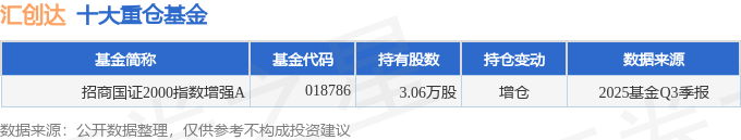 持有汇创达最多的基金为招商国证2000指数增强A,目前规模为0.38亿元,最新净值1.5054(10月28日),较上一交易日下跌0.02%,近一年上涨44.78%。该基金现任基金经理为邓童。