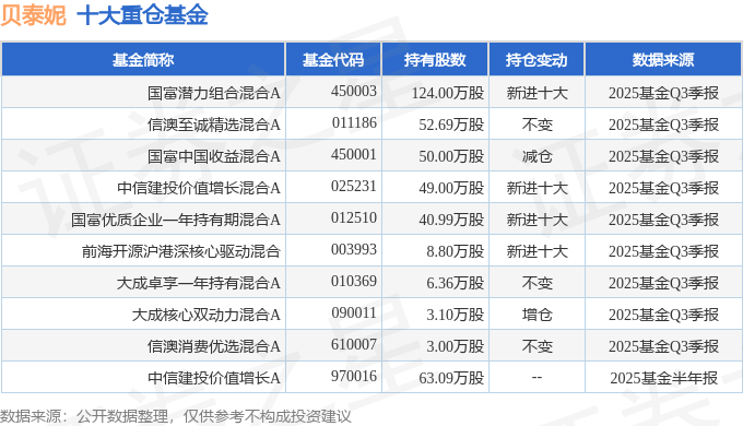 持有贝泰妮最多的基金为国富潜力组合混合A,目前规模为12.93亿元,最新净值1.12(10月28日),较上一交易日下跌0.97%,近一年上涨11.76%。该基金现任基金经理为徐荔蓉。