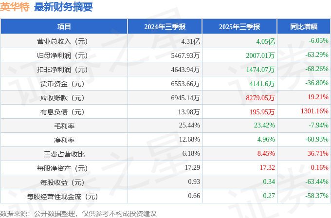 据证券之星公开数据整理,近期英华特(301272)发布2025年三季报。截至本报告期末,公司营业总收入4.05亿元,同比下降6.05%,归母净利润2007.01万元,同比下降63.29%。按单季度数据看,第三季度营业总收入1.62亿元,同比下降3.72%,第三季度归母净利润1070.5万元,同比下降55.66%。本报告期英华特公司应收账款体量较大,当期应收账款占最新年报归母净利润比达111.63%。