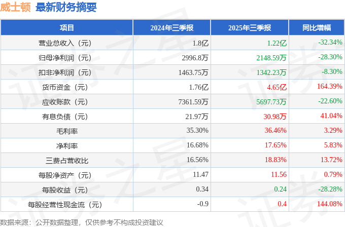 据证券之星公开数据整理,近期威士顿(301315)发布2025年三季报。截至本报告期末,公司营业总收入1.22亿元,同比下降32.34%,归母净利润2148.59万元,同比下降28.3%。按单季度数据看,第三季度营业总收入2985.12万元,同比下降40.51%,第三季度归母净利润535.61万元,同比下降41.24%。本报告期威士顿盈利能力上升,毛利率同比增幅3.29%,净利率同比增幅5.83%。
