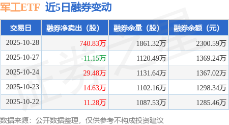 证券之星消息,10月28日,军工ETF(512660)融资买入7296.69万元,融资偿还6041.18万元,融资净买入1255.51万元,融资余额3.12亿元。