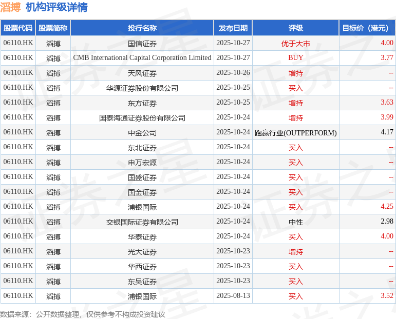 投行对该股的评级以买入为主,近90天内共有10家投行给出买入评级,近90天的目标均价为3.81港元。国信证券最新一份研报给予滔搏优于大市评级,目标价4港元。