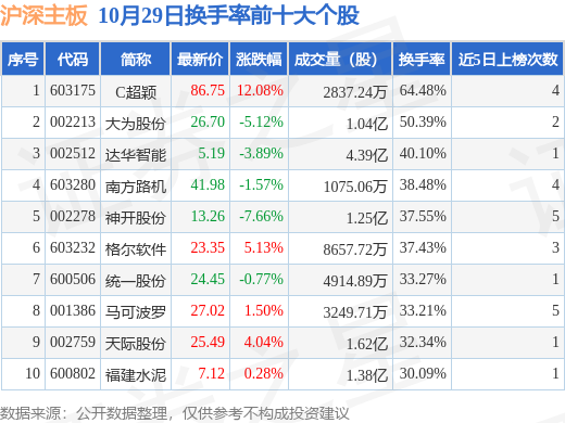 当日沪深主板换手率前10大个股中5只个股收涨,平均涨幅4.61%,其中C超颖(603175)以换手率64.48%排第一,6只个股近5个交易日中多次上榜。