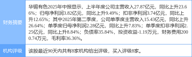 2025年8月17日,开源证券研究员孙二春,温佳贝发布了对华锡有色的研报《公司信息更新报告:广西省核心有色上市平台,有望充分受益锡锑价格上涨》,该研报对华锡有色给出“买入”评级。研报中预计2025~2027年公司归母净利润分别为9.42/10.51/13.28亿元(此前预计2025~2026年分别为8.08、10.78亿元),对应EPS分别为1.49/1.66/2.10元,对应2025年8月15日收盘价PE分别为17.8/15.9/12.6倍,锡、锑价格持续高位,公司内增外延不断成长,维持“买入”评级。证券之星数据中心根据近三年发布的研报数据计算,该研报作者对此股的盈利预测准确度为70.24%。