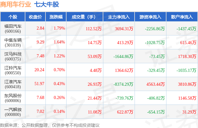 个股表现方面,商用车行业当日领涨股为福田汽车(600166),该股当日报收2.84,上涨1.79%,成交量112.52万,主力资金净流入3694.31万元。中集车辆(301039)以上涨1.64%紧随其后,该股当日成交量14.75万,主力资金净流入413.29万元。除此之外,汉马科技(600375)、江铃汽车(000550)、江淮汽车(600418)均进入当日牛股之列。具体个股列表见下表: