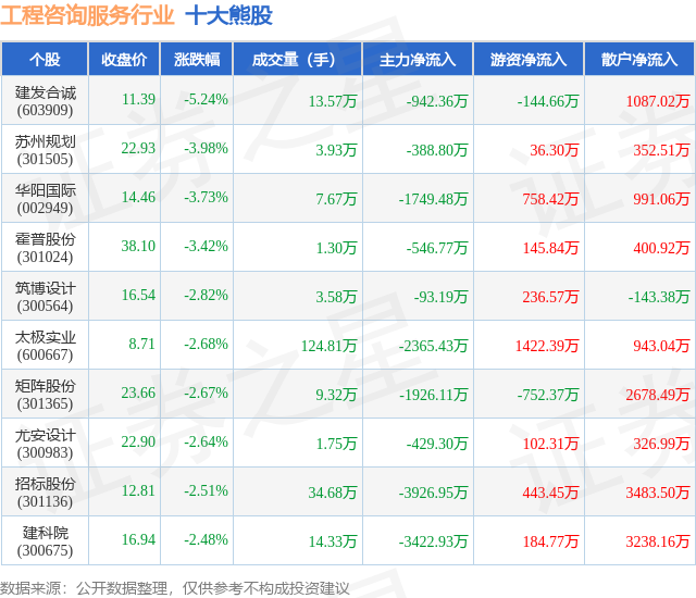 个股表现方面,工程咨询服务行业当日领跌股为建发合诚(603909),该股当日报收11.39,下跌5.24%,成交量13.57万,主力资金净流出942.36万元。苏州规划(301505)以下跌3.98%紧随其后,该股当日成交量3.93万,主力资金净流出388.8万元。除此之外,华阳国际(002949)、霍普股份(301024)、筑博设计(300564)均进入当日熊股之列。具体个股列表见下表:
