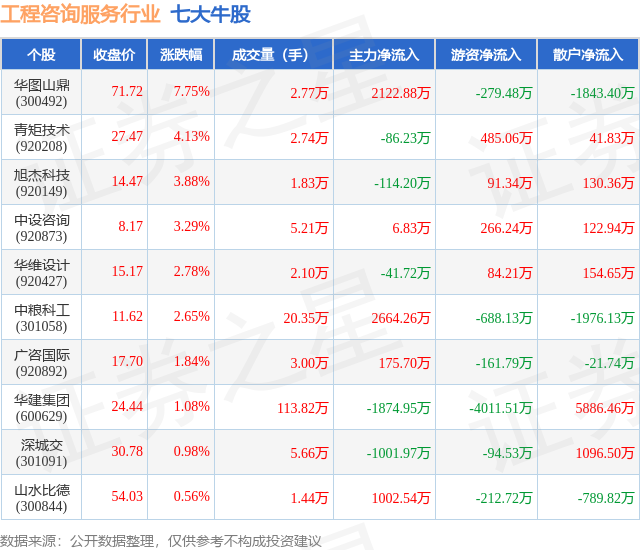 个股表现方面,工程咨询服务行业当日领涨股为华图山鼎(300492),该股当日报收71.72,上涨7.75%,成交量2.77万,主力资金净流入2122.88万元。青矩技术(920208)以上涨4.13%紧随其后,该股当日成交量2.74万,主力资金净流出86.23万元。除此之外,旭杰科技(920149)、中设咨询(920873)、华维设计(920427)均进入当日牛股之列。具体个股列表见下表: