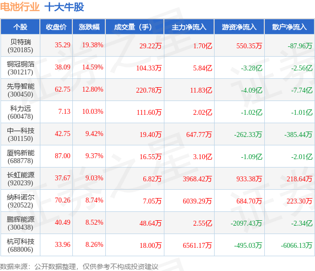 个股表现方面,电池行业当日领涨股为贝特瑞(920185),该股当日报收35.29,上涨19.38%,成交量29.22万,主力资金净流入1.7亿元。铜冠铜箔(301217)以上涨14.59%紧随其后,该股当日成交量104.33万,主力资金净流入5.84亿元。除此之外,先导智能(300450)、科力远(600478)、中一科技(301150)均进入当日牛股之列。具体个股列表见下表: