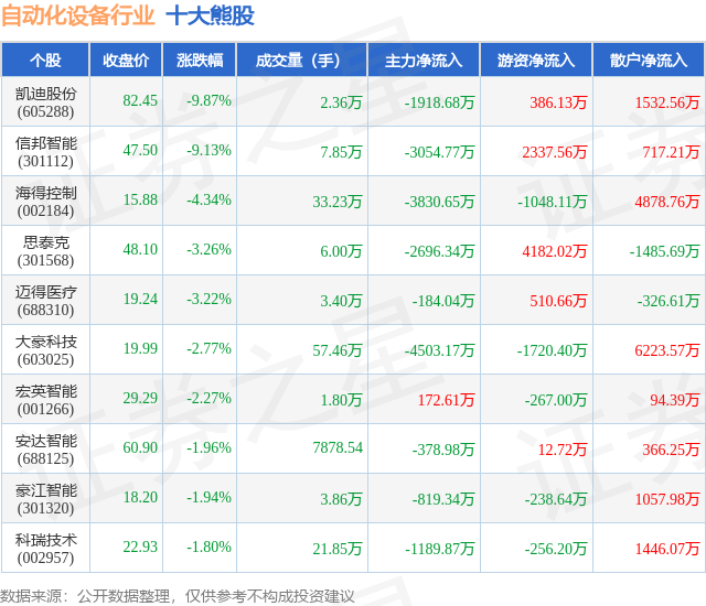 个股表现方面,自动化设备行业当日领跌股为凯迪股份(605288),该股当日报收82.45,下跌9.87%,成交量2.36万,主力资金净流出1918.68万元。信邦智能(301112)以下跌9.13%紧随其后,该股当日成交量7.85万,主力资金净流出3054.77万元。除此之外,海得控制(002184)、思泰克(301568)、迈得医疗(688310)均进入当日熊股之列。具体个股列表见下表: